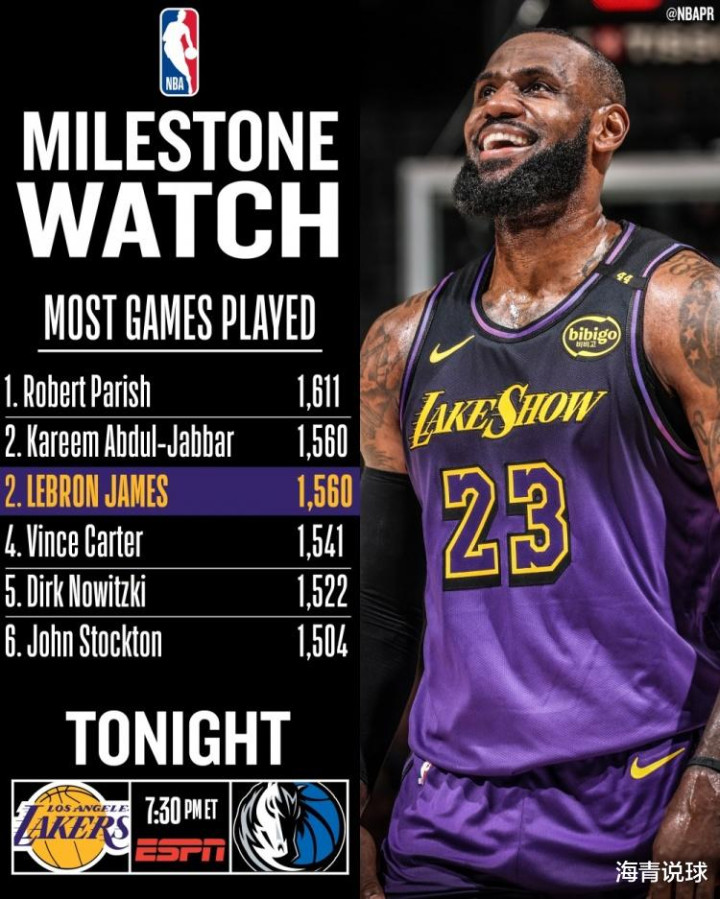 今天,湖人背靠背挑战独行侠。此役,勒布朗·詹姆斯迎来职业生涯第1561场常规赛,正式超越传奇中锋贾巴尔(1560场),独占NBA历史出场次数排行榜第二位,距离榜首的罗伯特·帕里什(1611场)仅差50场。这一里程碑再次印证了詹姆斯22年如一日的巅峰延续性,也为他辉煌的职业生涯添上浓墨重彩的一笔。